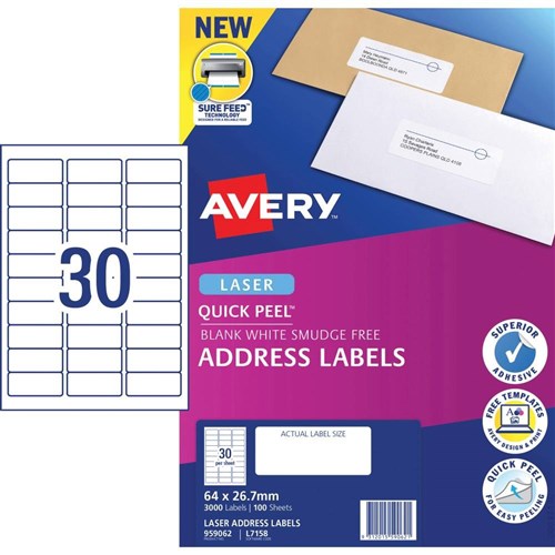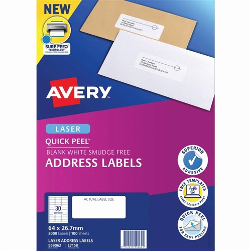 Avery Address Laser Labels 30UP L7158 64 x 26.7mm White 100 Sheets