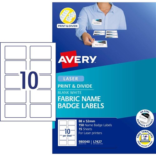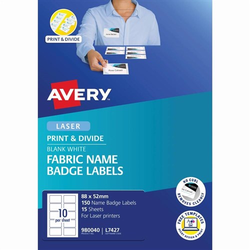 Avery Fabric Print & Divide Name Badge Laser Labels L7427 88x52mm 10UP 15 Sheets