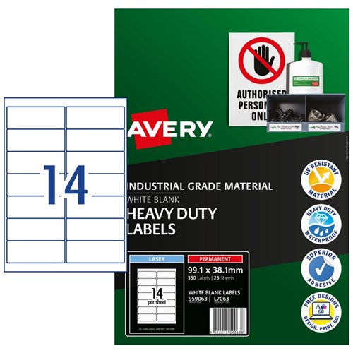 Avery Heavy Duty Laser Labels 14UP L7063 99.1x38.1mm White Waterproof, 25 Sheets