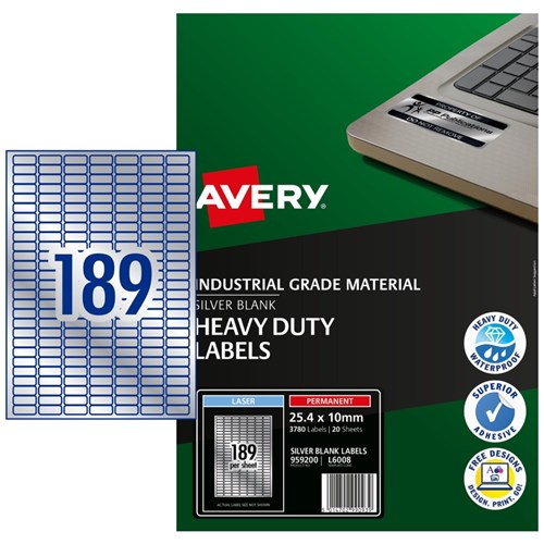 Avery Heavy Duty Laser Labels 189UP L6008 25.4x10 mm Silver asset tags, 20 Sheets