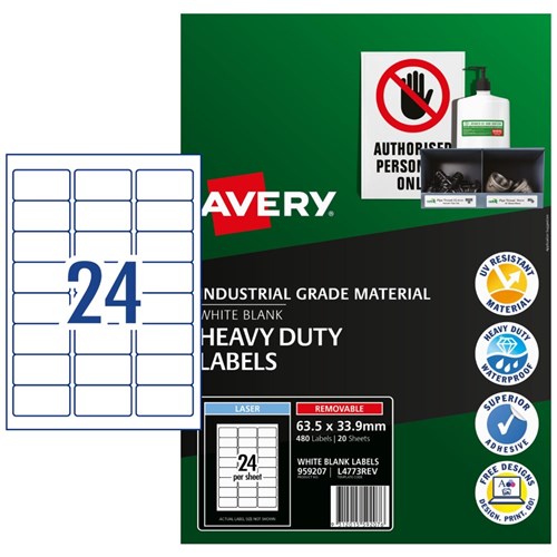 Avery Heavy Duty Removable Laser Labels L4773 63.5x33.9mm White 24UP 20 Sheets
