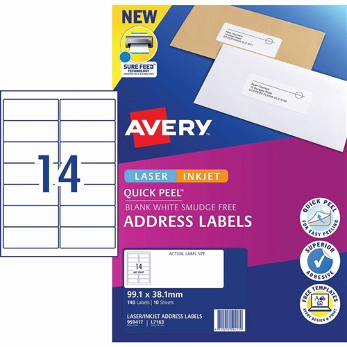 Avery Quick Peel Address Laser & Inkjet Label L7163 99.1x38.1 White 10 Sheets 14UP