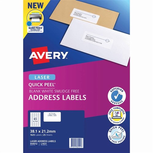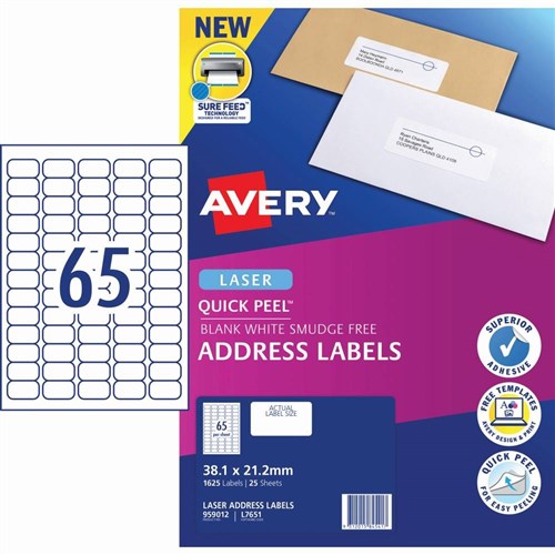 Avery Quick Peel Address Laser Labels 65UP L7651 38.1 x 21.2 White, 25 Sheets