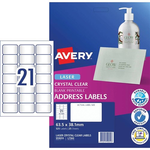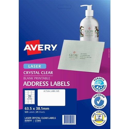 Avery Quick Peel Address Laser Labels L7560 63.5x38.1 Crystal Clear 21UP 25 Sheets