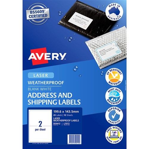 Avery Weatherproof Shipping Laser Label L7072 199.6x143.5 White 10 Sheets 2UP