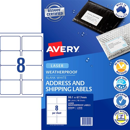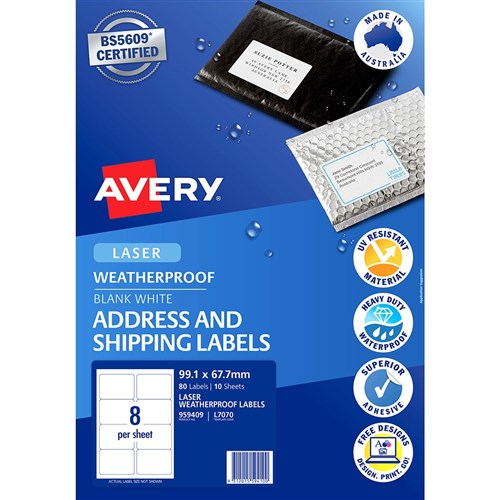 Avery Weatherproof Shipping Laser Labels L70707 99.1x67mm White 8UP 10 Sheets
