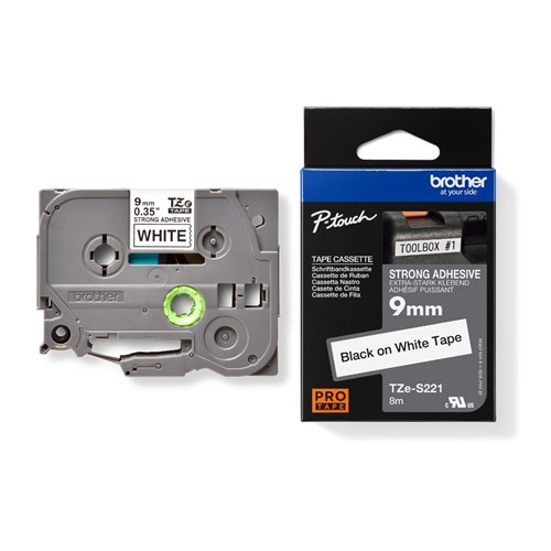 Brother TZES221 P-Touch Tape 9mm x 8m Black on White Strong Adhesive