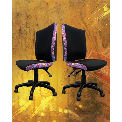 • A unique commercial fabrics designed by Andrea Adamson (Indigenous Artist) combined with K2 Black Fabric to upholster the chair.