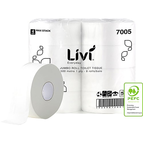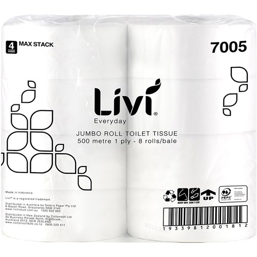 Livi Basics Toilet Paper Rolls 1 Ply Jumbo Roll 500m Box of 8