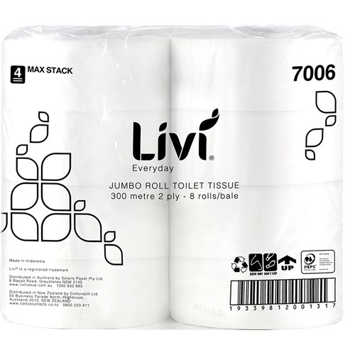 Livi Basics Toilet Paper Rolls 2 Ply Jumbo Roll 300m Box of 8 7006