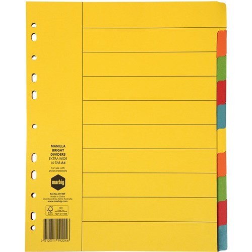Marbig Manilla Divider A4 10 Extra Wide Tab Bright Colours