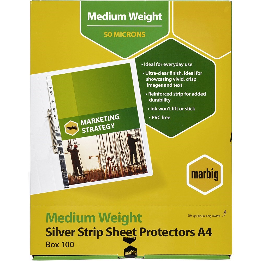 Marbig Sheet Protectors A4 Silver Strip Glass Clear Box Of 100