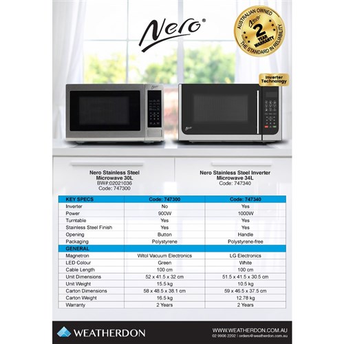 Nero Invert Microwave 34 Litres Stainless Steel 1000W 520L x 420W x 300mmH