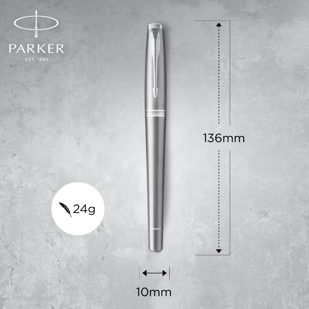 Metallic finish with a lightly brushed touch complemented by chrome trim and the signature Parker arrow clip.