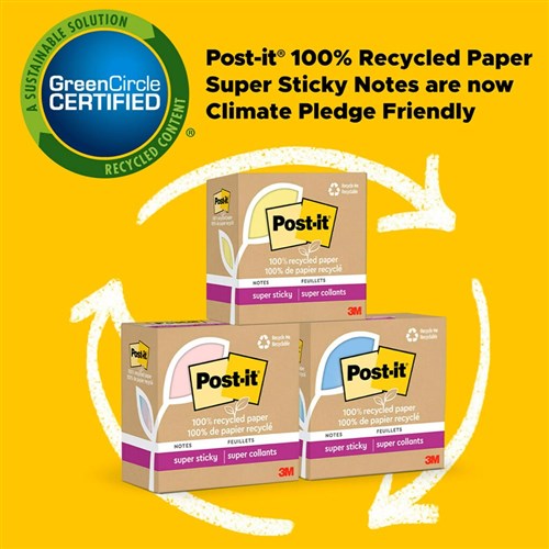 Post-It 654R-12SSCY Super Sticky Notes Recycled 76mm x 76mm Yellow Pack Of 12