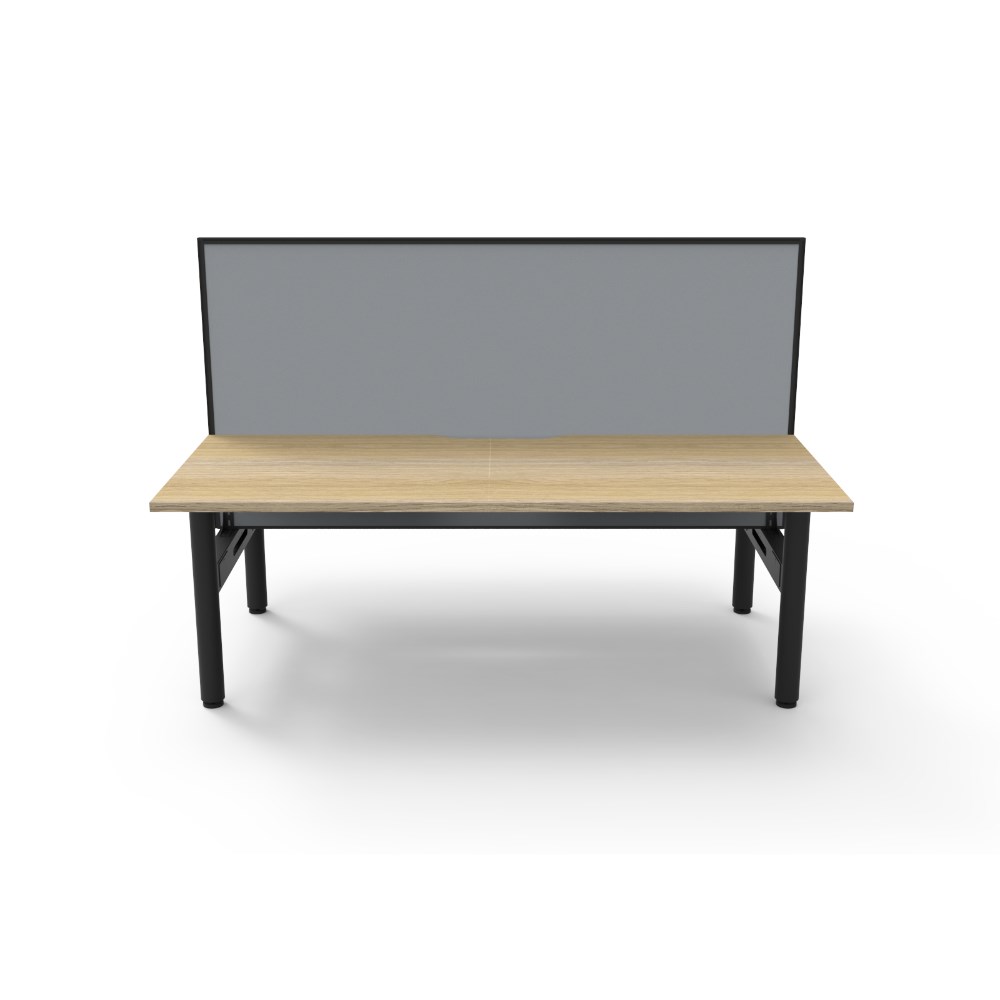 Natural Oak top Black Satin frame. Double sided workstation with screen.
