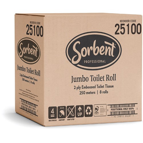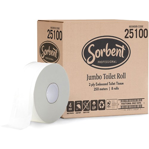 Sorbent Professional Jumbo Toilet Tissue Rolls 2 Ply 250m Carton of 8