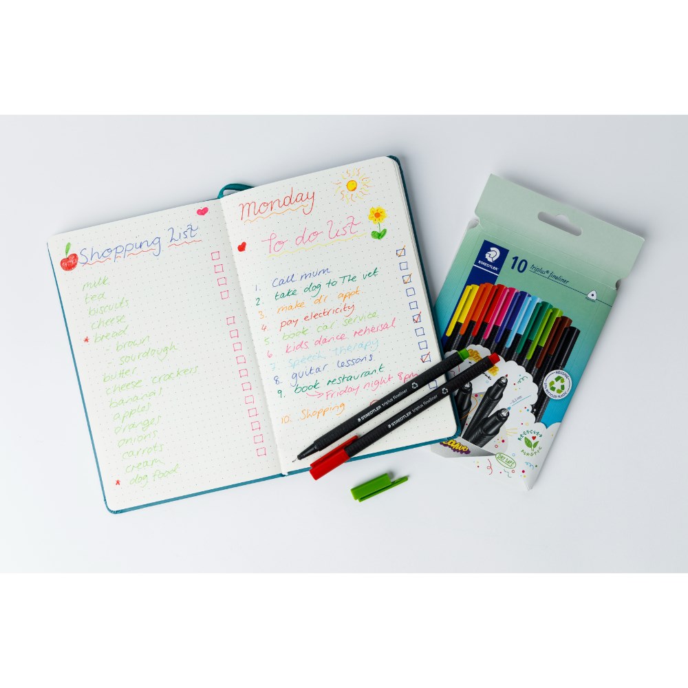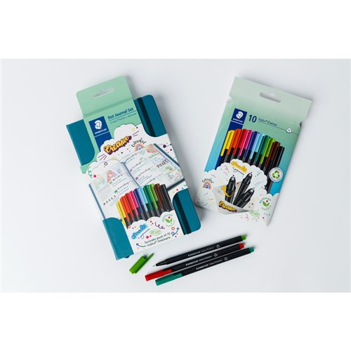 • Includes one 192 page dot journal made from premium vegan leather with a pack of 10 Staedtler triplus fineliners in assorted colours.