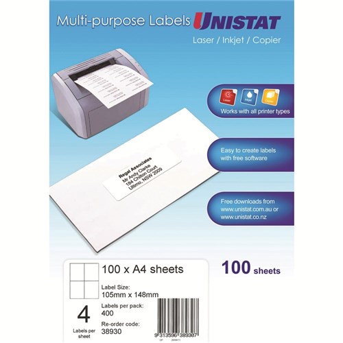 Unistat Laser Copier & Inkjet Labels 105x148mm White 4UP 100 Sheets 38930