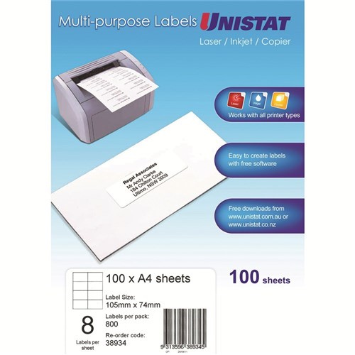 Unistat Laser Copier & Inkjet Labels 105x74mm White 8UP 100 sheets 38934