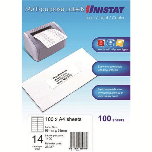 Unistat Laser Copier & Inkjet Labels 98x38mm White 14UP 100 Sheets 38937